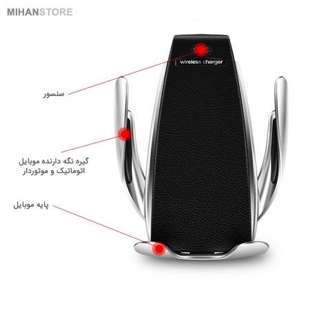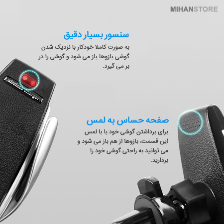 پایه نگهدارنده و شارژر وایرلس اتومبیل با قابلیت نصب داخل دریچه کولر علاوه بر نگهداشتن گوشی، قابلیت شارژ وایرلس گوشی های مجهز به فناوری شارژ بیسیم Qi تمامی نیاز های شما برای اینکه بدون هیچ محدودیتی امکان تماشا و شارژ همزمان گوشی موبایل خود را در داخل خودرو در اختیار داشته باشید را قرار می دهد. این پایه به وسیله کابلی که داخل بسته بندی آن قرار دارد به خروجی برق usb خودرو شما متصل می شود. این محصول دارای سنسور الکترونیکی است که با نزدیک کردن گوشی به آن بازوها باز شده و پس از قراردادن گوشی خود به خود بسته می شود. بنابراین کار شما را بسیار راحت می کند. این محصول با پشتیبانی از تکنولوژی Quick charge قادر است به صورت سریع گوشی موبایل شمارا به صورت بی سیم شارژ کند، بدنه خارجی آن از پلاستیک ABS و بدنه داخلی آن از جنس سیلیکون است تا از آسیب به گوشی موبایل شما جلوگیری کند، همچنین هولدر S5 قابلیت چرخش 360 درجه را دارد و میتوانید به میزانی که نیاز دارید آنرا چرخش دهید.