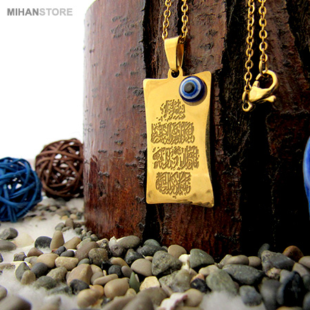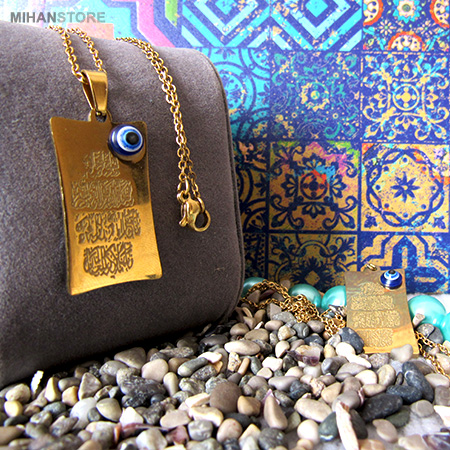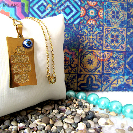 این گردنبند از استیل رنگ ثابت ساخته شده و دارای پلاک با آیه شریفه ی وان یکاد و چشم نظر خاص و زیبا می باشد. استفاده از گردنبندهای قرآنی برای دوری از چشم زخم، سحر و آسیب به مال و جان توصیه شده است. این گردنبند با سوره  قرآنی، حس آرامش خوبی را به شما منتقل کرده و مناسب استفاده کودک تا بزرگسال است. گردنبند طرح مستطیل با وان یکاد و چشم نظر که از جنس استیل طلایی رنگ ثابت و ضد حساسیت می باشد و هیچ گونه حساسیتی برای پوست ایجاد نمی کند و با خیال آسوده از این گردنبند استفاده نمایید. این گردنبند یک زنجیر از مدل دیپلمات ساده طلایی با طول شصت سانتیمتر دارد که با قفل مدل قلاب محکم بسته می شود. این گردنبند می تواند مناسب آقایون ، بانوان و همچنین مناسب کودکان باشد.
