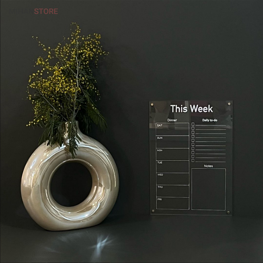 تخته برنامه ریزی هفتگی مغناطیسی شفاف این امکان را به شما می دهد تا با داشتن یک برنامه ی منظم هفتگی کارهای خود را سازمان دهی کنید.همچنین با داشتن بخش جزییات کارهای روزانه به شما در طبقه بندی، رسیدگی و انجام کارهای تان کمک می کند. امکان ثبت رویداد های هفته ،ثبت قرار ملاقات و دارا بودن بخش یادداشت های متفرقه از مزیت های این محصول است . پلکسی گلس اجرا شده در این محصول به ضخامت دو میلی متر است و در آن چهار عدد آهن ربای نئودیمیوم درجه یک بکار رفته است . آهن ربای این محصول با قدرت بالا نسبت به وزن محصول احتمال سرخوردگی را به صفر می رساند. طرح چاپ شده در دو رنگ سفید و مشکی در پشت پلکسی گلس اجرا شده است. با یک ماژیک وایت برد قابلیت نوشتن و پاک کردن مکرر روی این تخته وجود دارد.