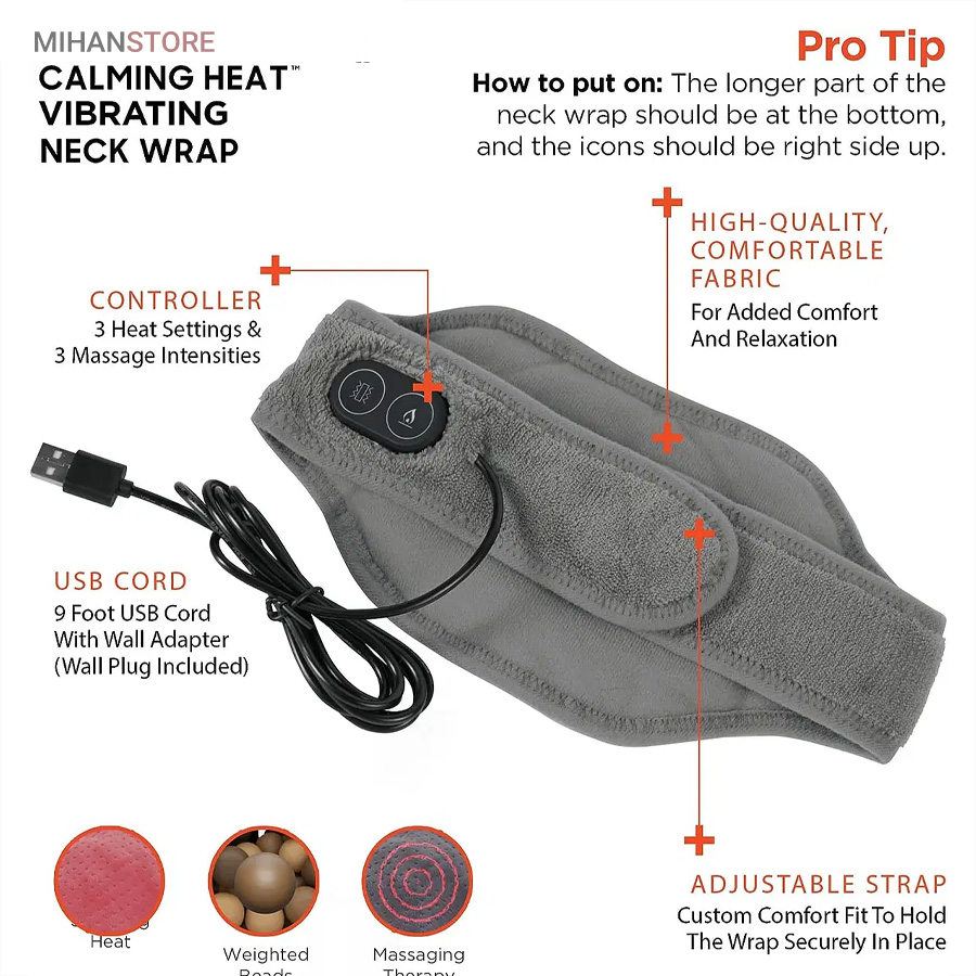 ماساژور و پد حرارتی برقی گردن با هدف تسکین درد و کمک به بهبود دردهای ناحیه گردن کمک میکند و به صورت حوله ای بسیار نرم بر روی ناحیه گردن بسته میشود. گرمای تسکین دهنده و ارتعاشات آرامش بخش سنگ های معدنی همراه با تنظیم گرما و ارتعاشات ماساژ با کیفیت بالا از قابلیت های این ماساژور میباشد همچنین پوشش پارچه ای 100% پلی استر و دانه های پرکننده 77% دانه های سفالی ، ‌23% نمد الیاف پلی استر و دارای بند قابل تنظیم میباشد.