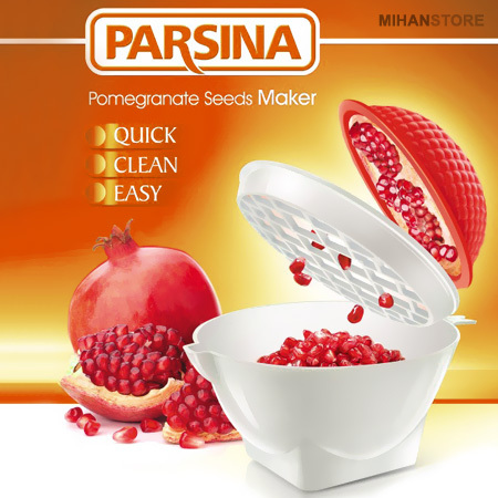از آنجا که دون کردن دانه های انار کار تقریبا دشوار و زمان بریست انار دون کن پارسینا به کمک شما آمده است تا بتوانید به وسیله آن انار را به راحتی دون کنید و با آن انواع نوشیدنی ،دسر ،بستنی و ... تهیه کنید. فقط کافیست انار را از وسط نصف کرده و بر روی پارسینا قرار دهید و درب آن را ببندید و با پشت قاشق بر روی آن ضربه بزنید. دانه های انار به راحتی جدا شده و درون کاسه ریخته می شوند.